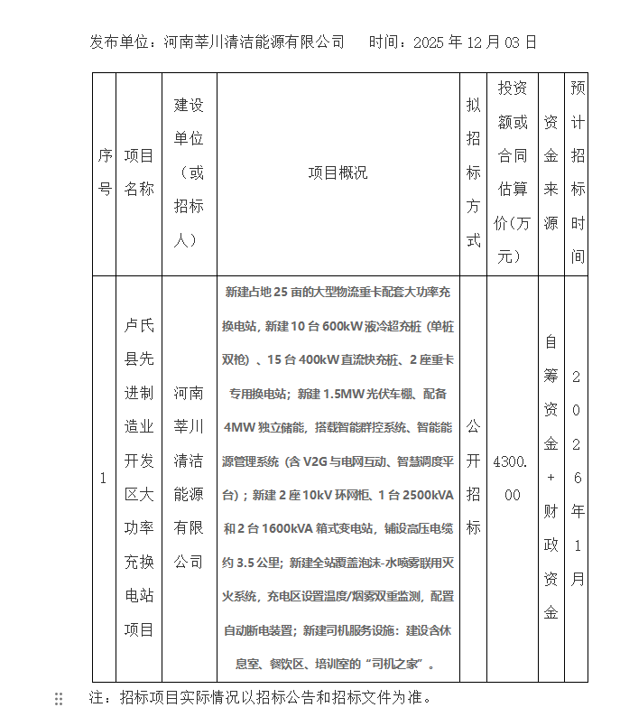 卢氏县先进制造业开发区大功率充换电站项目招标计划