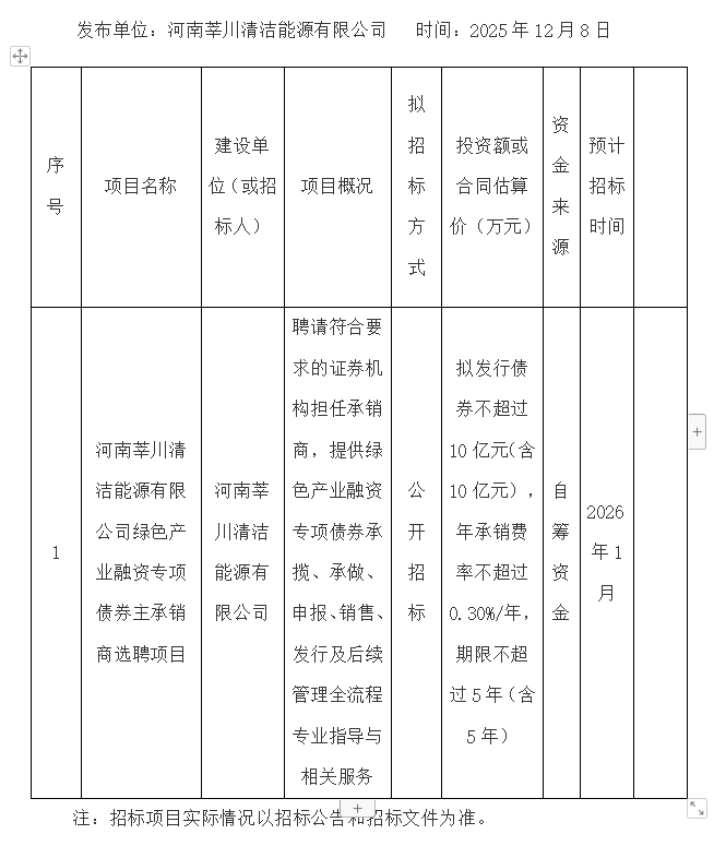 河南莘川清洁能源有限公司绿色产业融资专项债券主承销商选聘项目