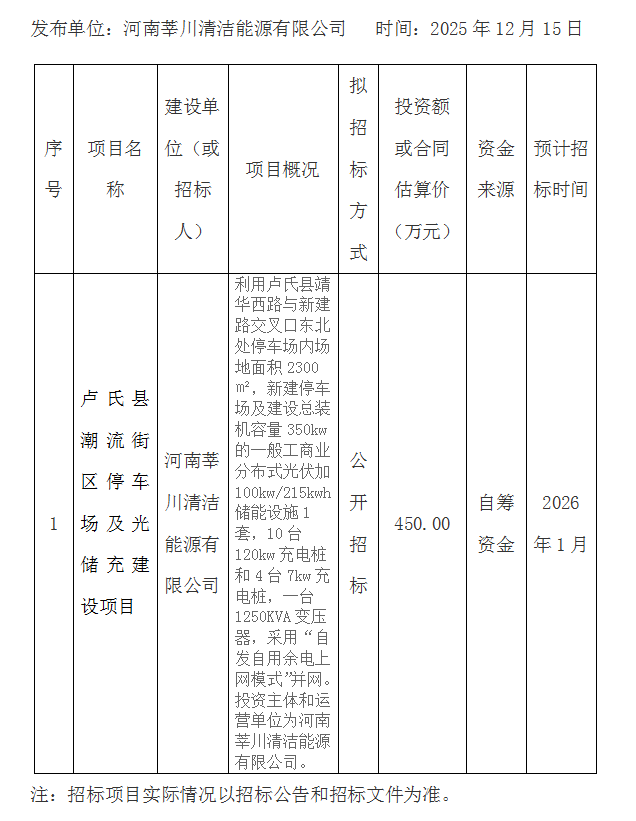 卢氏县潮流街区停车场及光储充建设项目招标计划.docx
