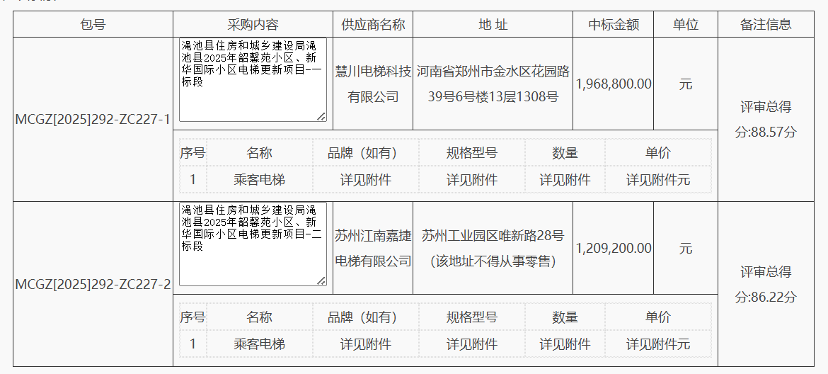 [河南省·三门峡市·渑池县][公开招标][材料设备]渑池县住房和城乡建设局渑池县2025年韶馨苑小区、新华国际小区电梯更新项目-成交公告